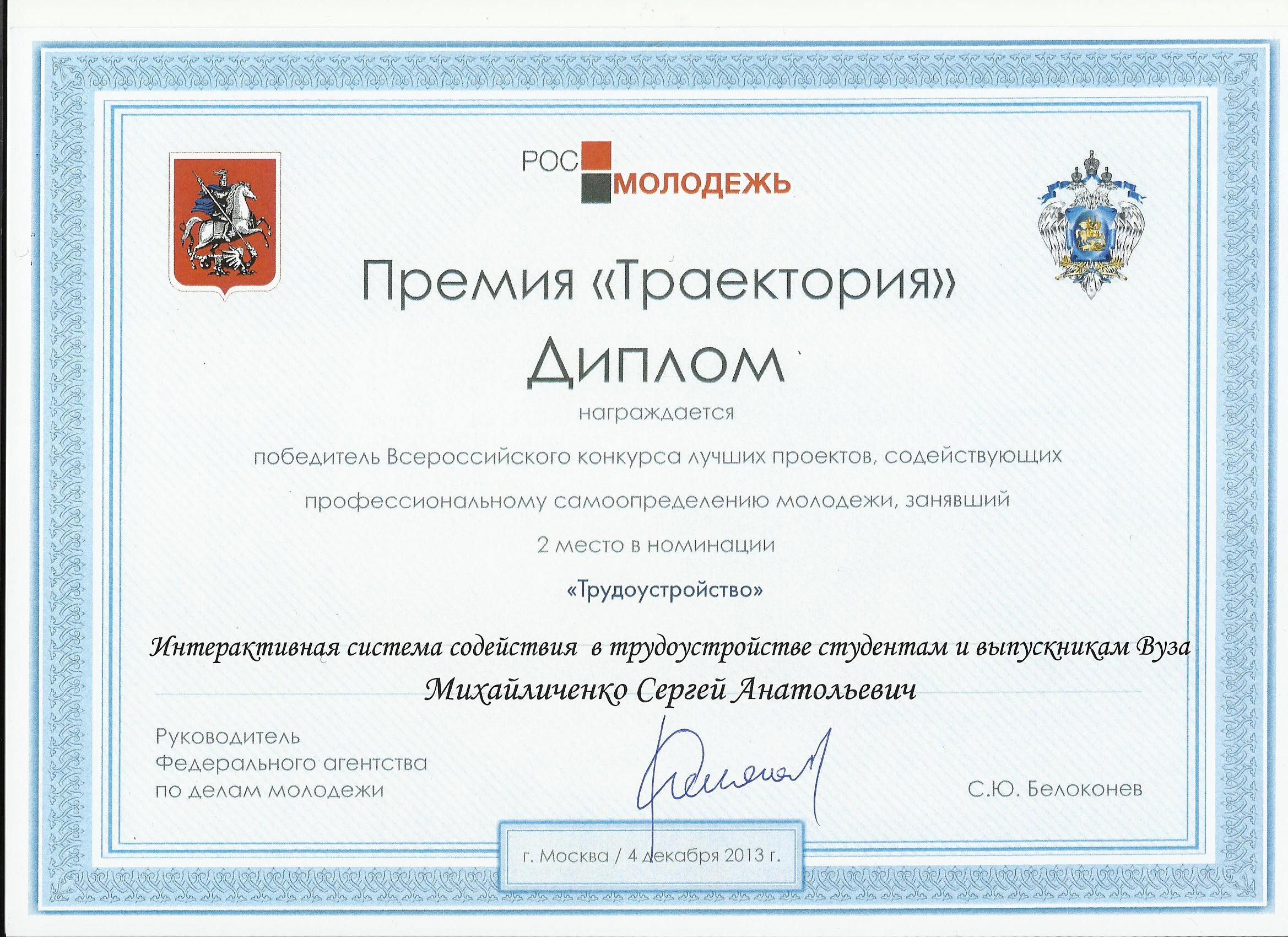 Всероссийская премия«Траектория» за лучшие проекты, содействующие профессиональному самоопределению молодежи (4 декабря 2013г.)