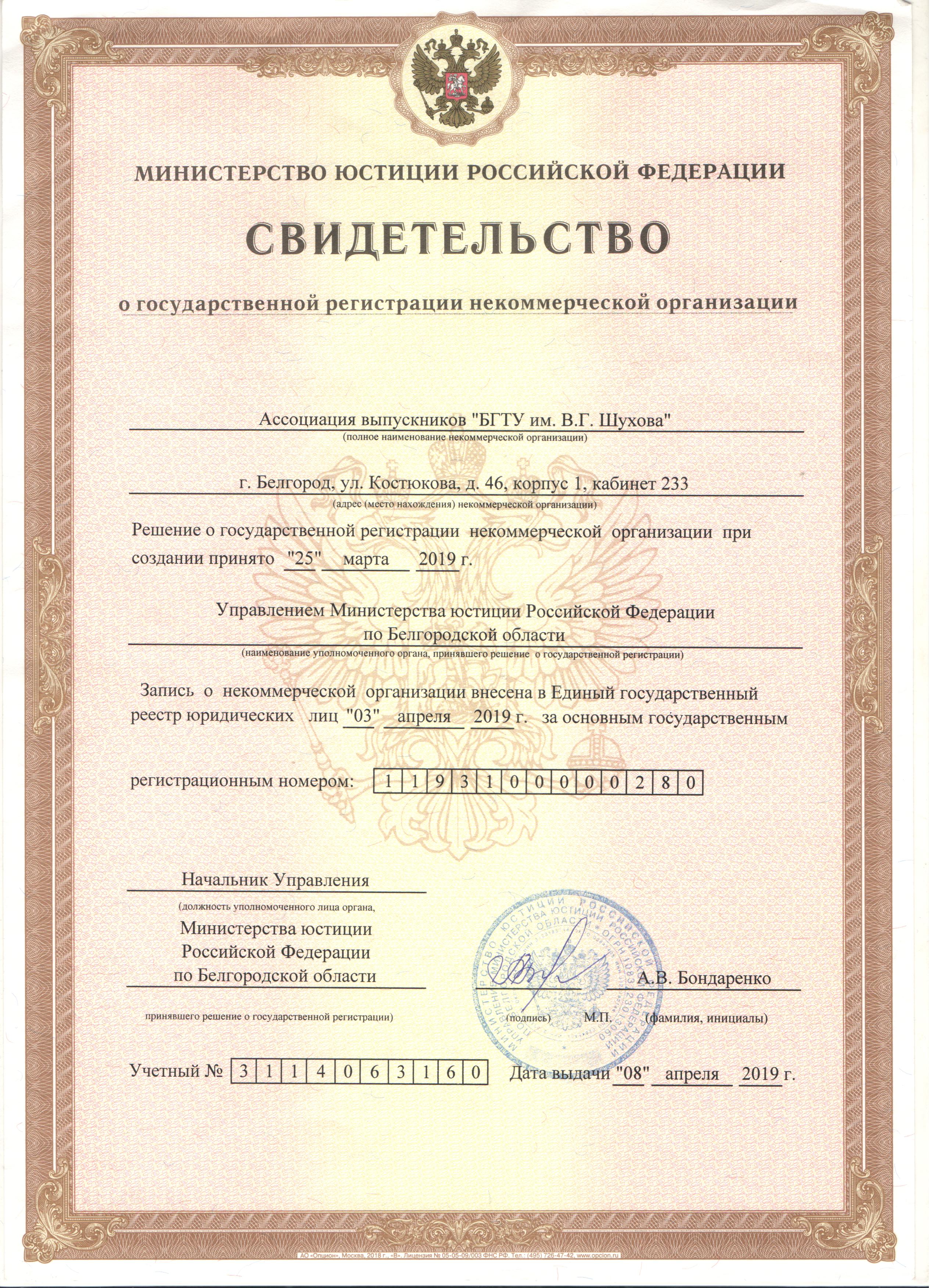 Cвидетельство о государственной регистрации НКО Ассоциация выпускников "БГТУ им. В.Г. Шухова"